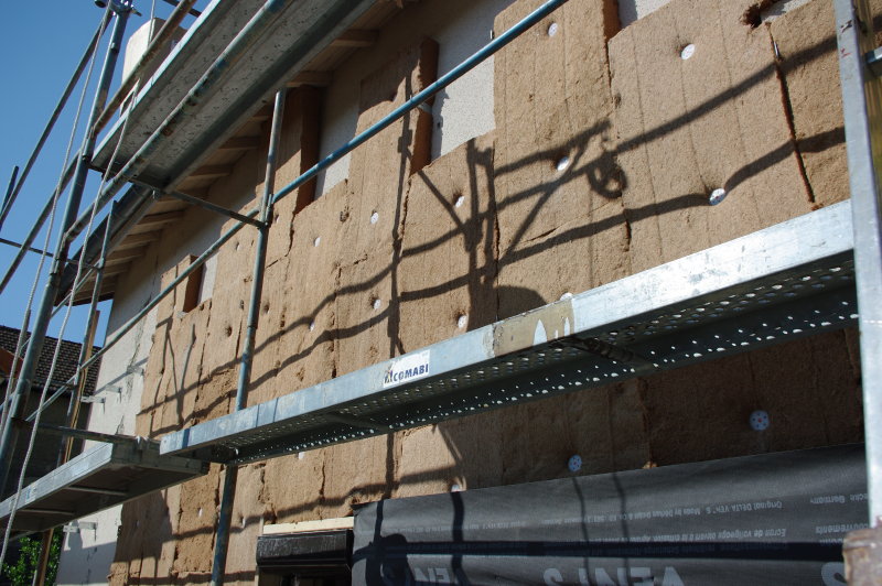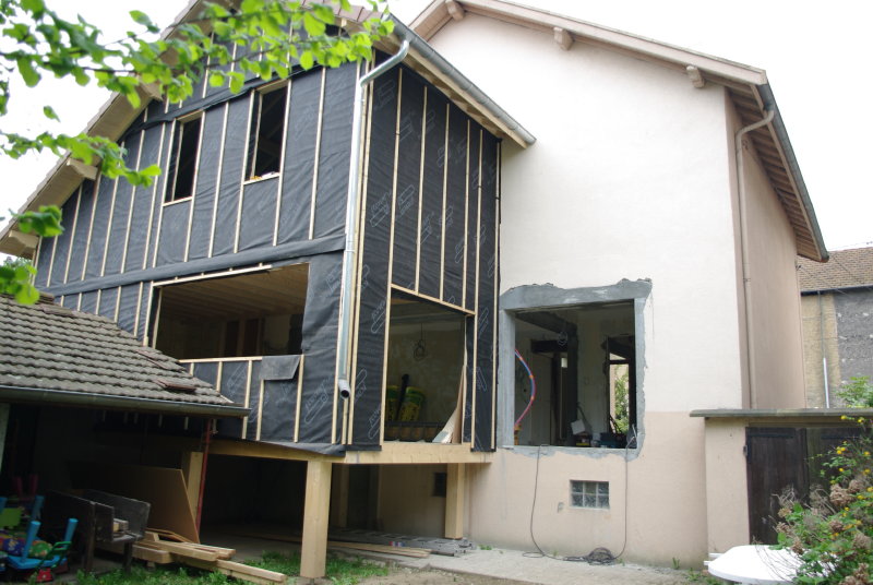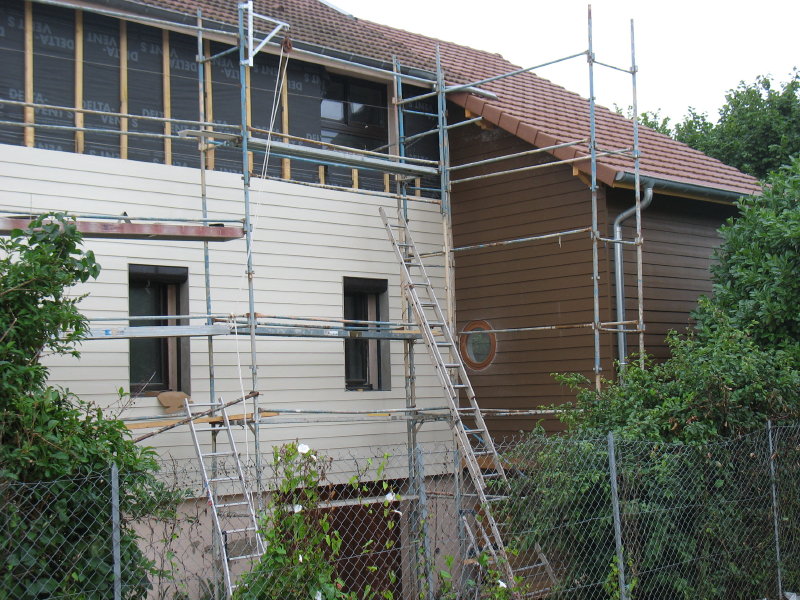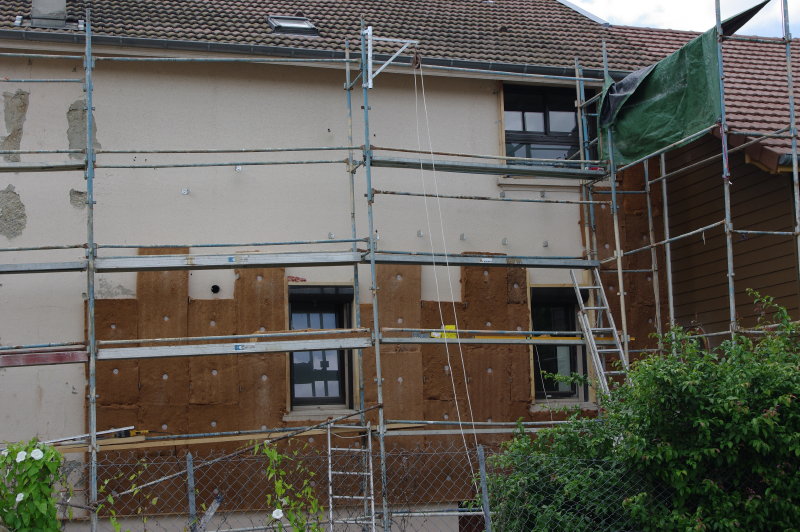 Dans une maison des années 50, une grosse rénovation thermique par l'exterieure avec 120mm de fibre de bois et bardage composite, remplacement des menuiseries par des menuiseries isolantes aluminium et volet roulant électrique, soufflage de ouate de cellulose dans les combles perdus. Le bardage composite cellulose ciment permet une grande stabilité aux intempéries et évite l'entretien.